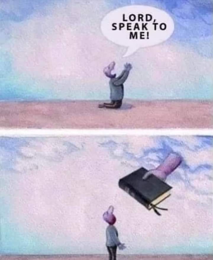Further, this meme implies that an individual person can simply sit down and understand the Bible. While yes the Church has always taught that the average person can read and understand everything necessary for salvation in Scripture, that is very different from what the meme implies. Much in Scripture is difficult and any person who reads alone is simply going to confirm from Scripture what that one already believed and not hear from God. Yes, “have no fear” is very clear, but it is also very generic and like a charlatan’s prophecy can be applied to life a number of ways. When someone is praying to God for guidance and crying out, “Lord, speak to me” general advice does not cut it, that individual wants wisdom. [I am deliberately not talking about a person who cries out “Lord, speak to me” in pain or grief because I refuse to believe anyone would post this meme with those cries in mind. Clearly those individuals want God’s presence in a way no book can appease.] The cry, “Lord speak to me” is one of confusion, where the person needs clarity and precision not generalities. Reading Scripture can prepare us for life in some ways, but there are times where life is genuinely confusing and expecting memorized Scripture to be our sole guide is narrow minded. How are we to expect the Bible to apply easily to every situation in life? We cannot instead we must ask what does God expect, how does God expect to communicate with us?