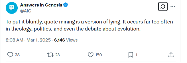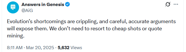 This claim is accurate and I applaud AiG for repeatedly making this claim in their social media posts. The issue is that they repeatedly employ quote mining in their articles, videos, and social media posts. Further, they lie and say they do not. The article linked in footnote 3 below is full of quote mines from Old Testament scholars. In that article AiG is trying make the claim that Old Testament scholars come to their conclusions about the Bible to placate the theory of evolution and what the quotes are saying is that these scholars– based on their reading of Genesis– see no conflict with evolution, which is completely different. They also often use this same tactic when talking about evolutionary biologists trying to establish the biologists have less confidence than they do. (Click for example) And AiG Is not the only organization to use this tactic (though they are the only ones I have seen call it out), I frequently see YEC organizations quote mine the caveats or qualifications in scientists claims in a way that completely misleads the audience only to trace the source and find out the scientist was saying something different.
